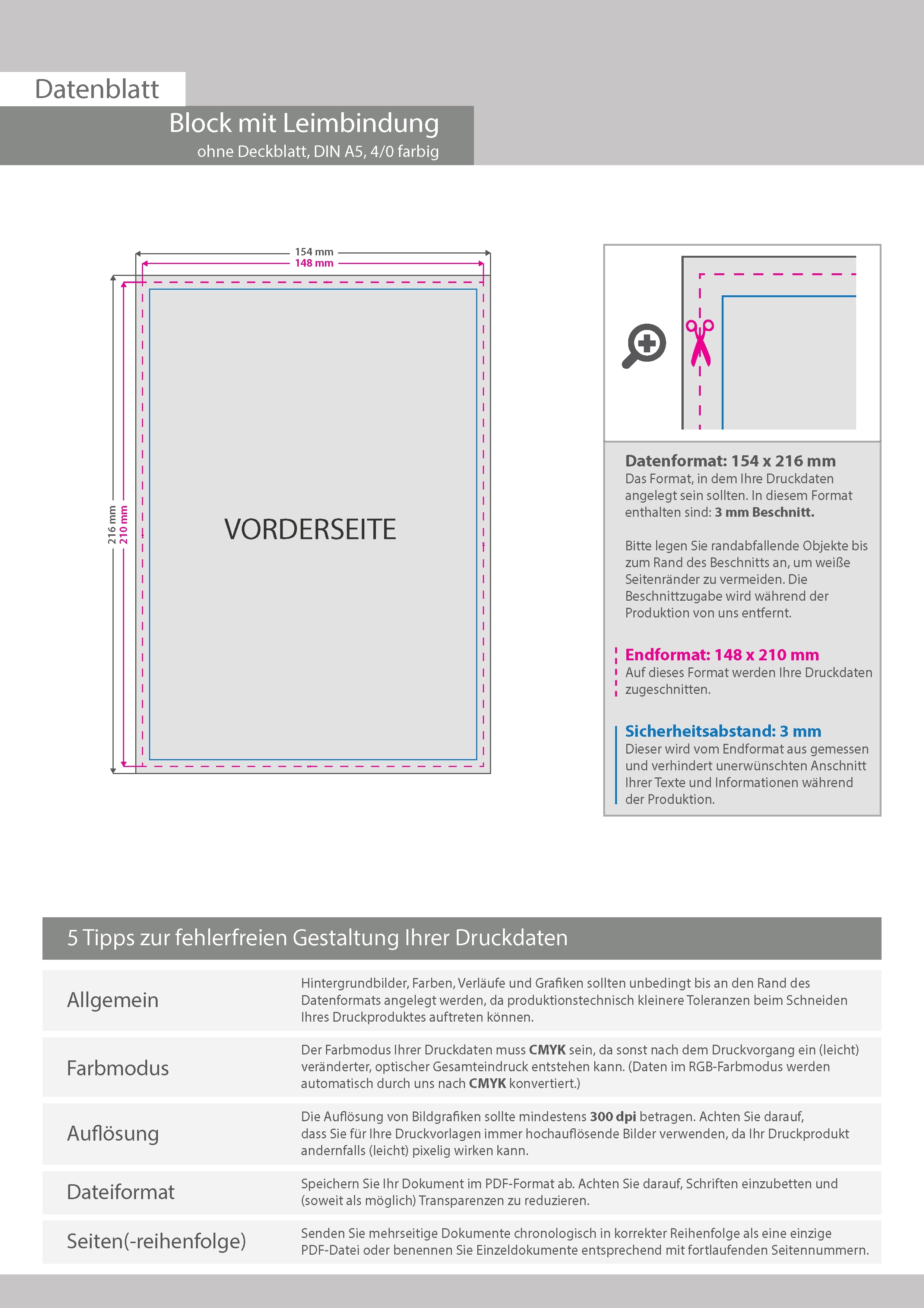Block mit Leimbindung, DIN A5, 10 Blatt, 4/0 farbig einseitig bedruckt