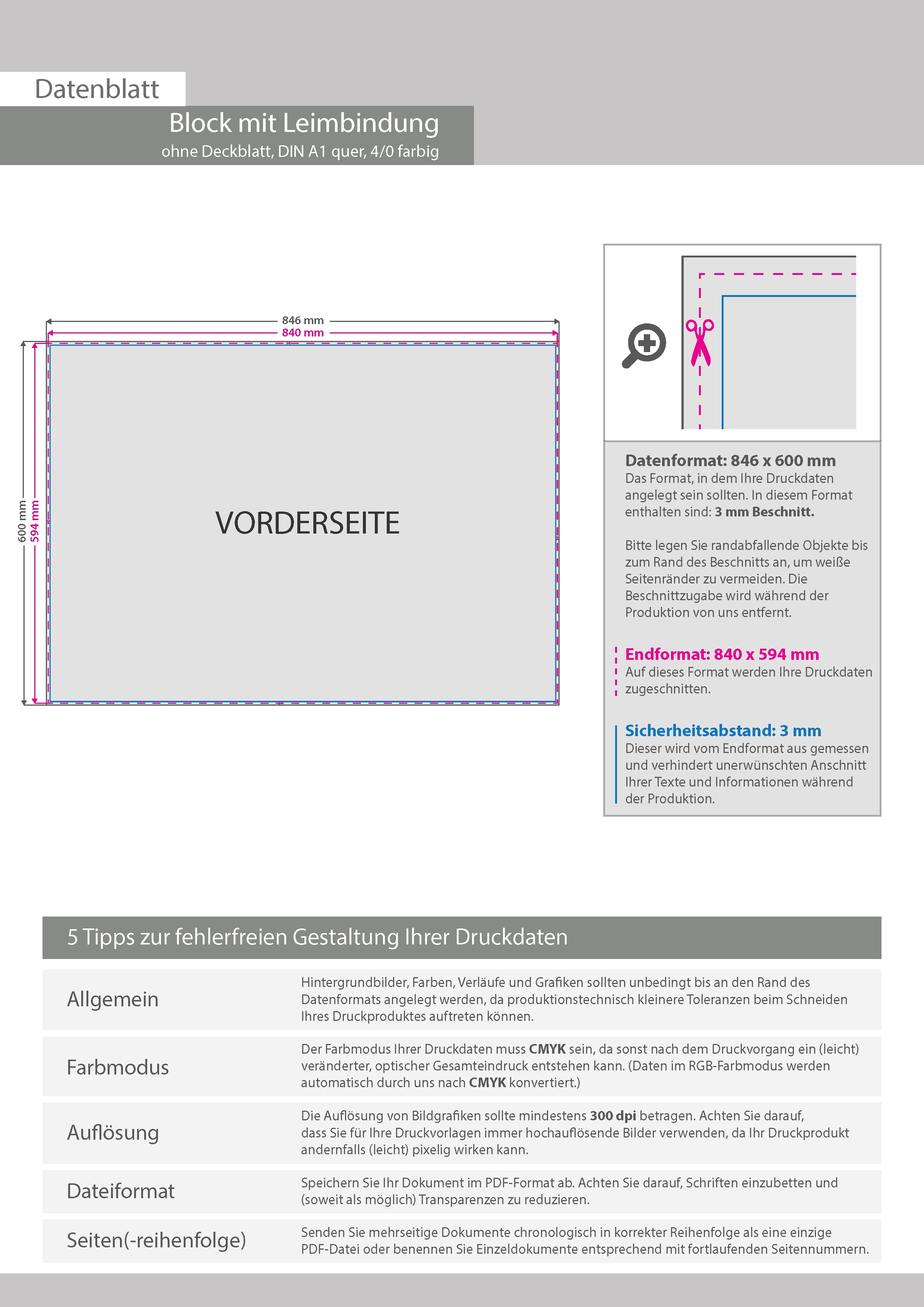 Block mit Leimbindung, DIN A1 quer, 200 Blatt, 4/0 farbig einseitig bedruckt