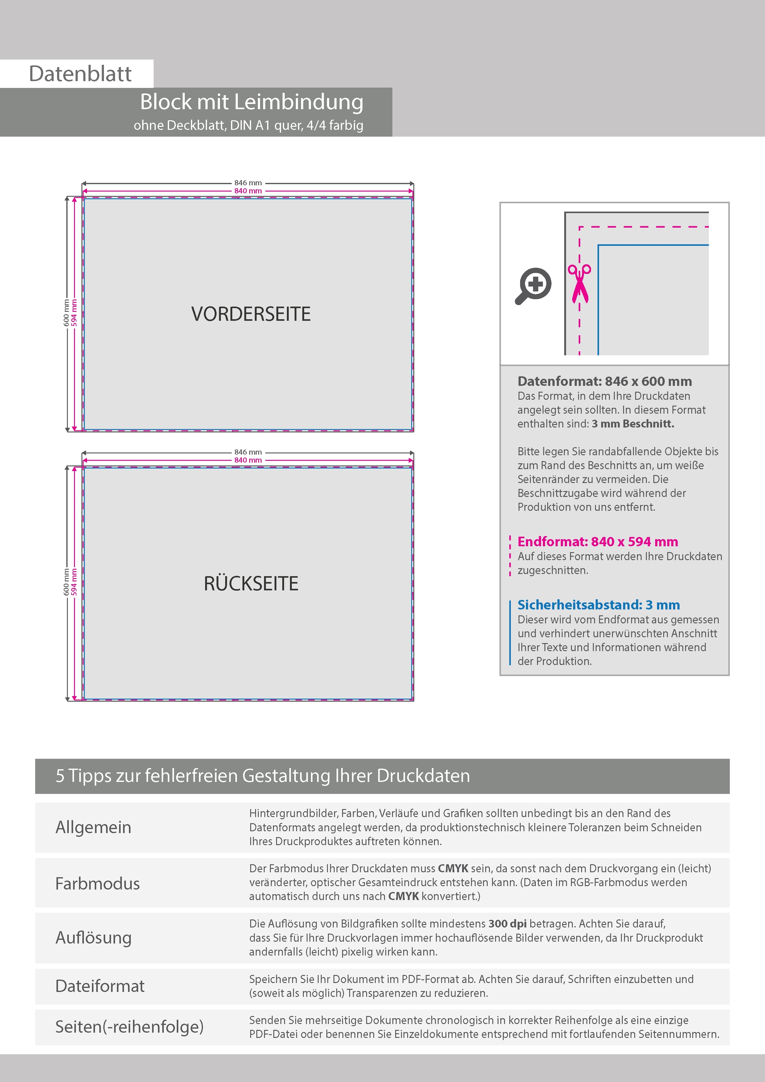 Block mit Leimbindung, DIN A1 quer, 10 Blatt, 4/4 farbig beidseitig bedruckt