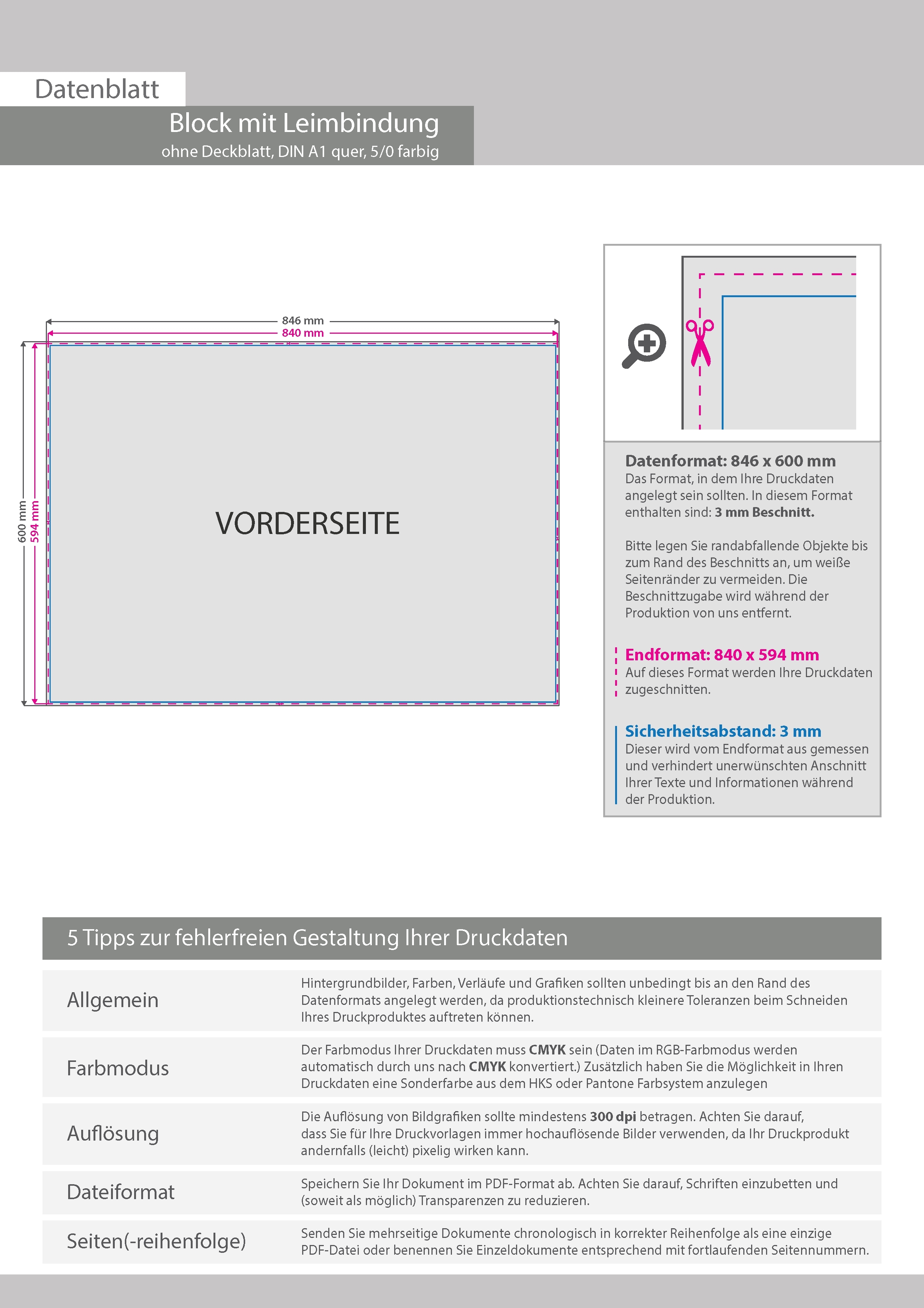 Block mit Leimbindung, DIN A1 quer, 25 Blatt, 5/0 farbig einseitig bedruckt (CMYK 4-farbig + 1 Sonderfarbe HKS oder Pantone)